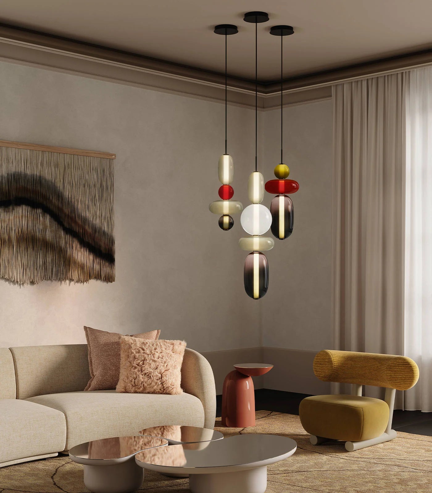 The Tonda Pendant is a floating composition of light and balance. Featuring four softly rounded glass globes arranged along a slender illuminated structure, it captures the calm, organic rhythm found in nature’s smoothest forms. Each sphere glows with gentle depth, while the linear core keeps the silhouette modern and refined. Tonda is designed to feel like a suspended sculpture — present, luminous, and effortlessly elegant.